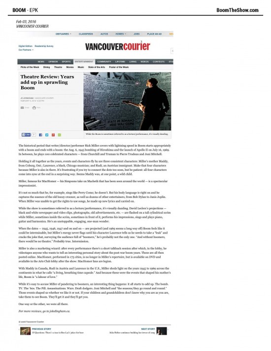The historical period that writer/director/performer Rick Miller covers with lightning speed in Boom starts appropriately with a boom and ends with a boom: the Aug. 6, 1945 bombing of Hiroshima and the launch of Apollo II on July 16, 1969. In between, he plays 100 celebrated characters — from Churchill and Truman to Pierre Trudeau and Joni Mitchell.